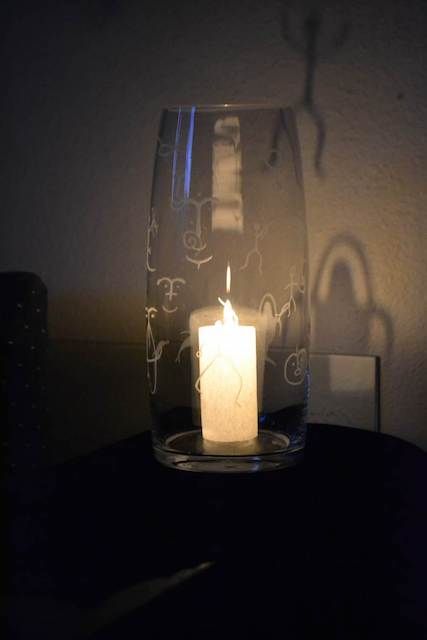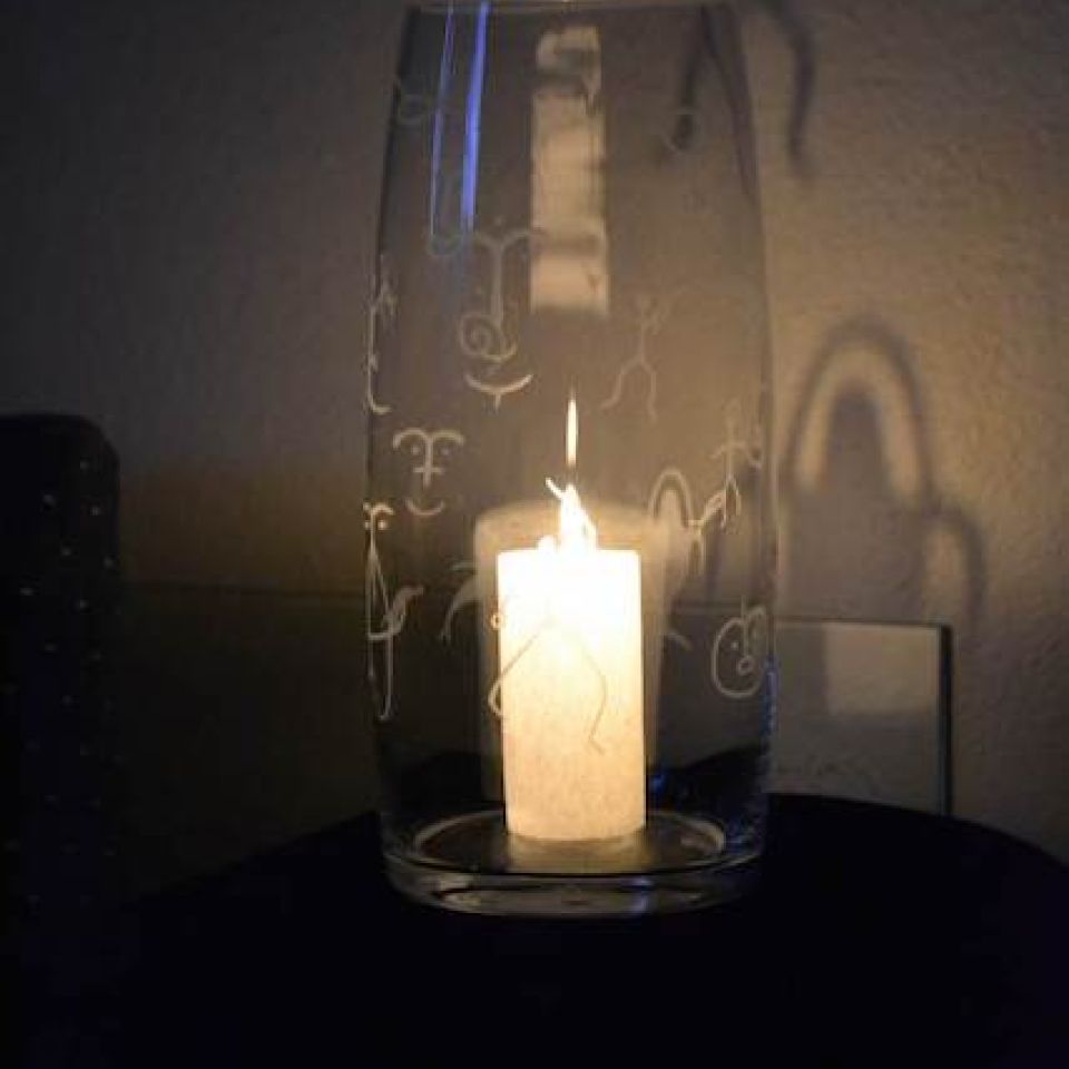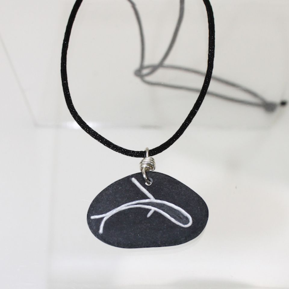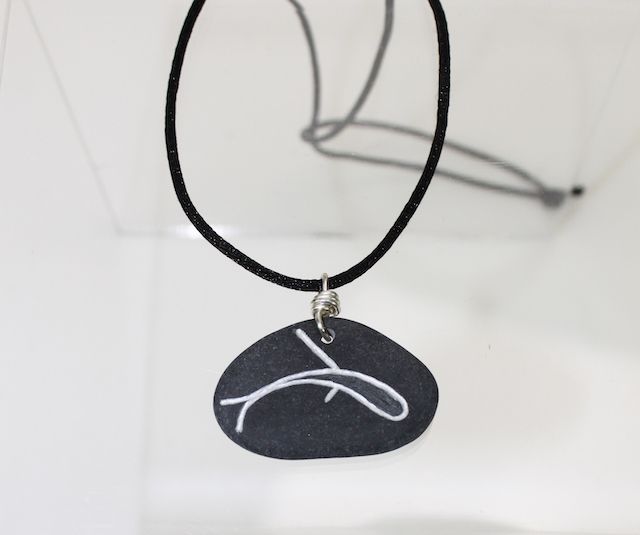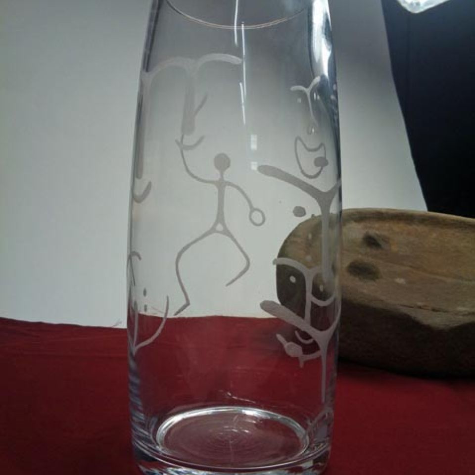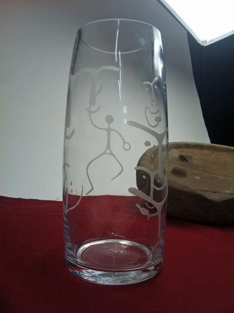 She will begin a piece by beachcombing and collecting water-rounded rocks. These become necklaces, earrings, and keychains. In addition, Barton carves Alutiiq petroglyphs onto glass, including stemware and vases.