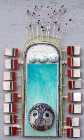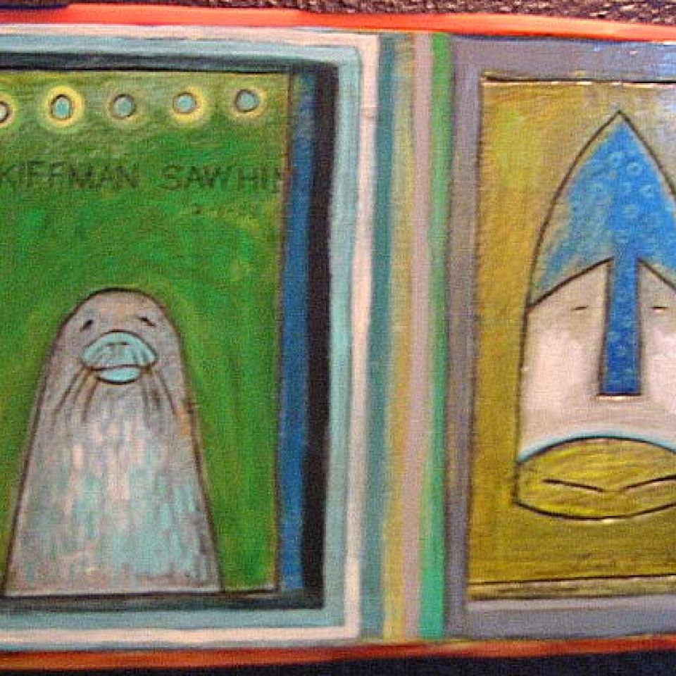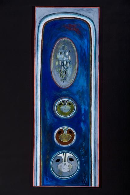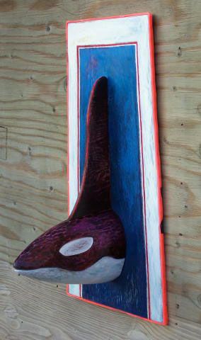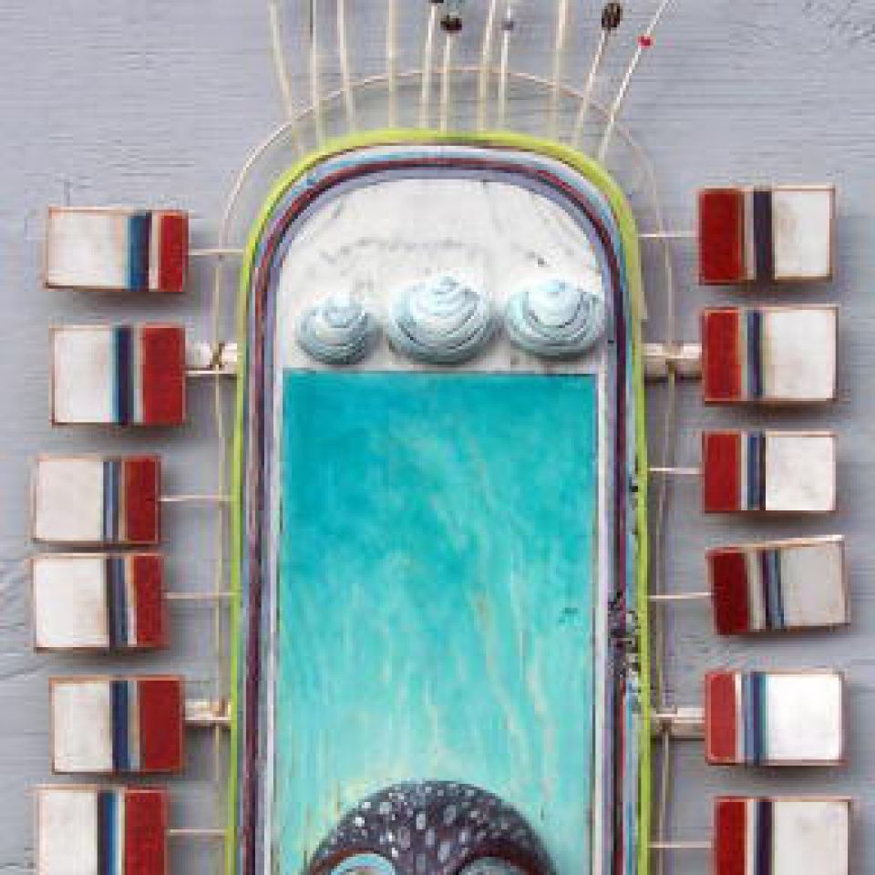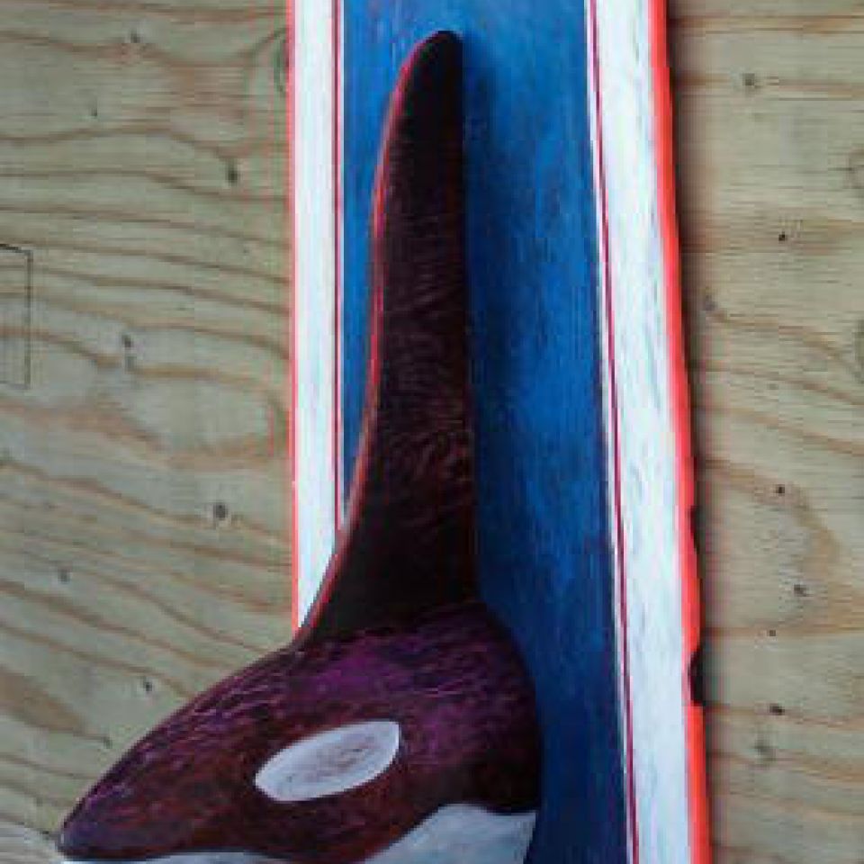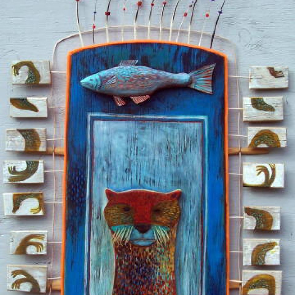 “At the heart of my work are stories and memories of adventures on and in the waters surrounding Kodiak Island: beach walks, skiff rides, hunting, subsistence, and commercial fishing days. Old fishing boats, gear sheds, and beaches are places I go to find fluorescent vinyl buoys, bright pieces of plexiglass, sea-scraped marine-grade plywood, cedar for carving. Lines carved, and areas sanded and painted again, reveal layers of paint and pencil markings. These images intentionally echo elements of historical design found in ancient Alutiiq hunting and fishing related objects and show the reverence I hold for the people who made them and the beautiful and perilous life they once lived on this island.