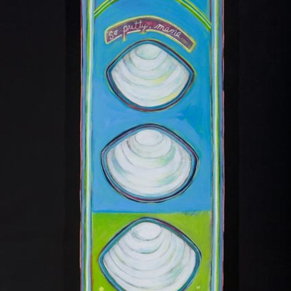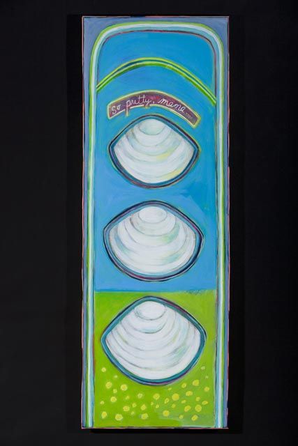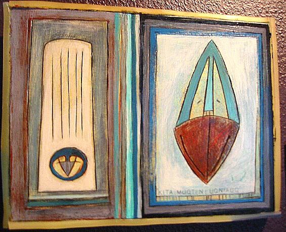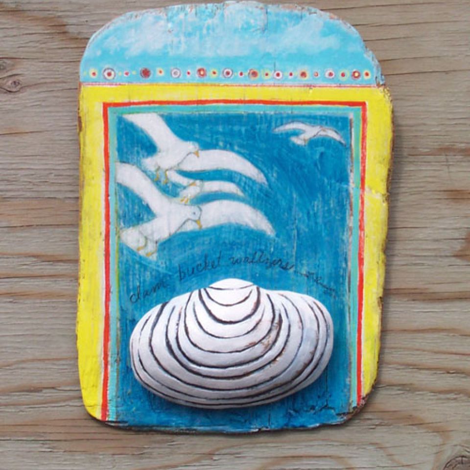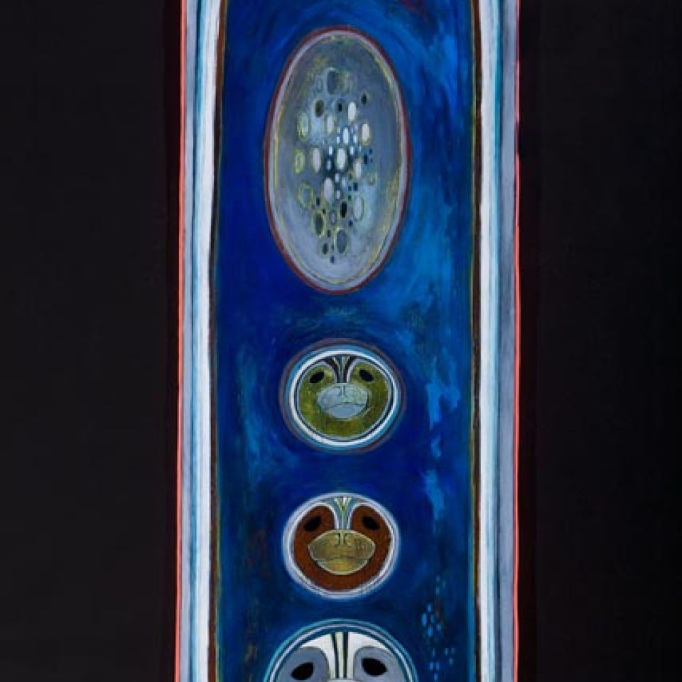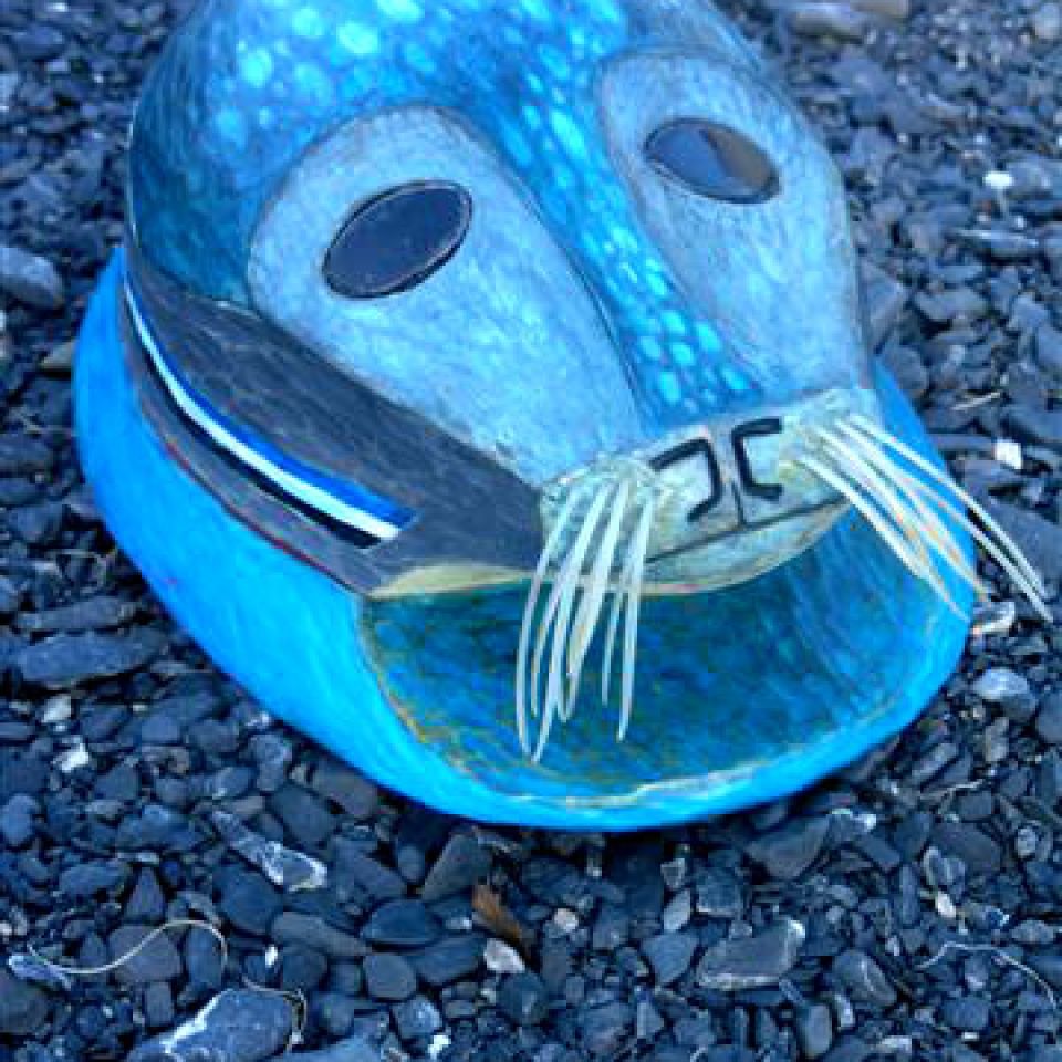 “At the heart of my work are stories and memories of adventures on and in the waters surrounding Kodiak Island: beach walks, skiff rides, hunting, subsistence, and commercial fishing days. Old fishing boats, gear sheds, and beaches are places I go to find fluorescent vinyl buoys, bright pieces of plexiglass, sea-scraped marine-grade plywood, cedar for carving. Lines carved, and areas sanded and painted again, reveal layers of paint and pencil markings. These images intentionally echo elements of historical design found in ancient Alutiiq hunting and fishing related objects and show the reverence I hold for the people who made them and the beautiful and perilous life they once lived on this island.