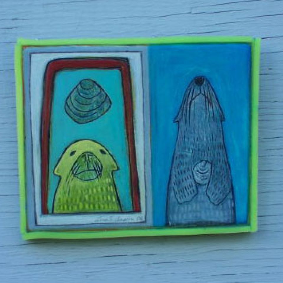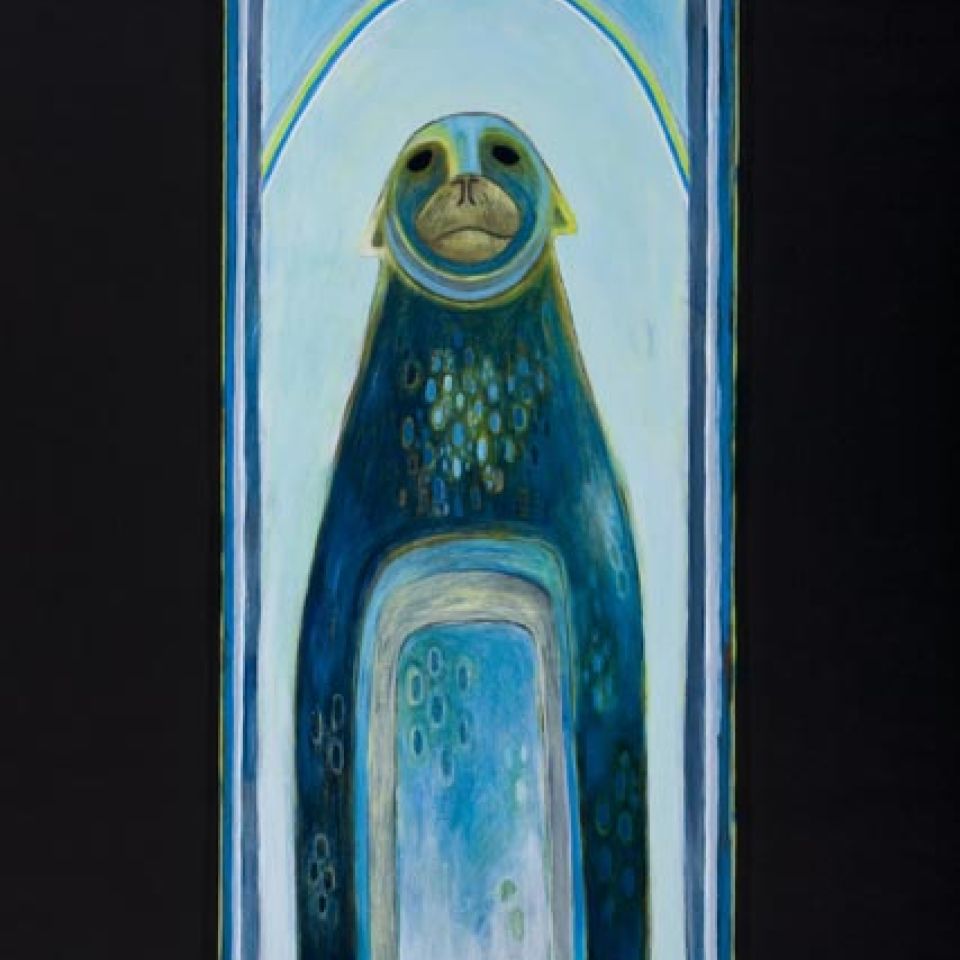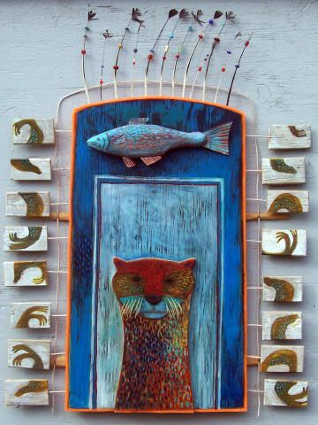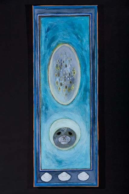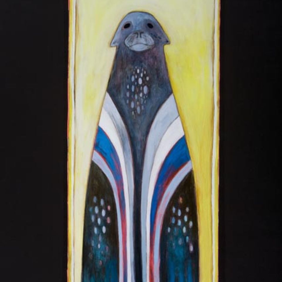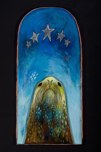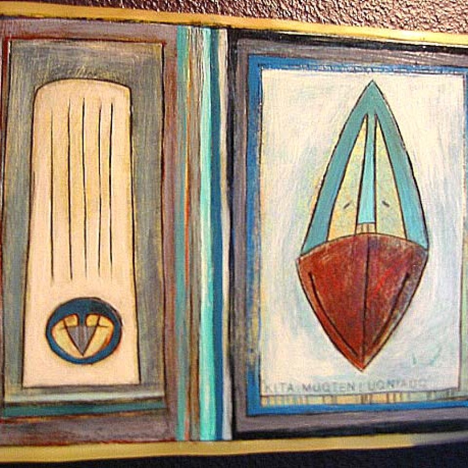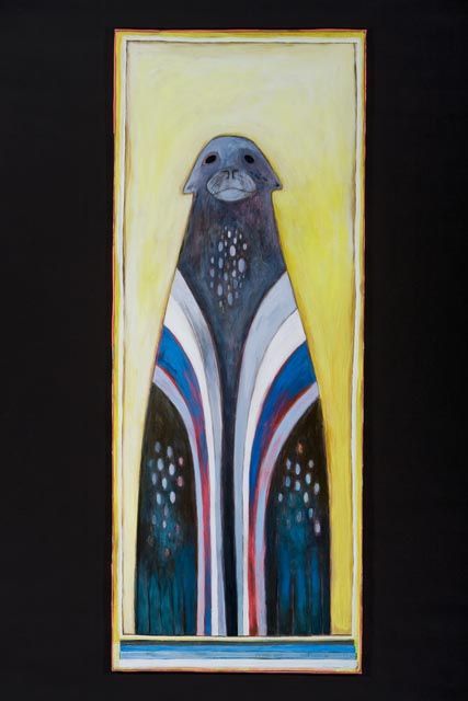The days of all kinds of weather and attitudes of animals and people of this Island; the humor found in the things we say, the combination of Alutiiq/Russian/English languages to explain situations or create names and titles, experiences of encounters with local animals, birds, and marine life, and the belief systems and unspoken rules, the kind of local knowledge that can save your life if the weather comes up—these are what I pay attention to and what are on my mind as I show up every day to work in my studio, carve knife into wood, layer acrylic, draw into it with pencil, hit areas with sandpaper, and paint with oils. . . . the stories of my lifetime’s heritage that are worth telling.”