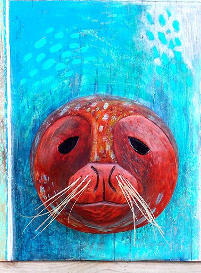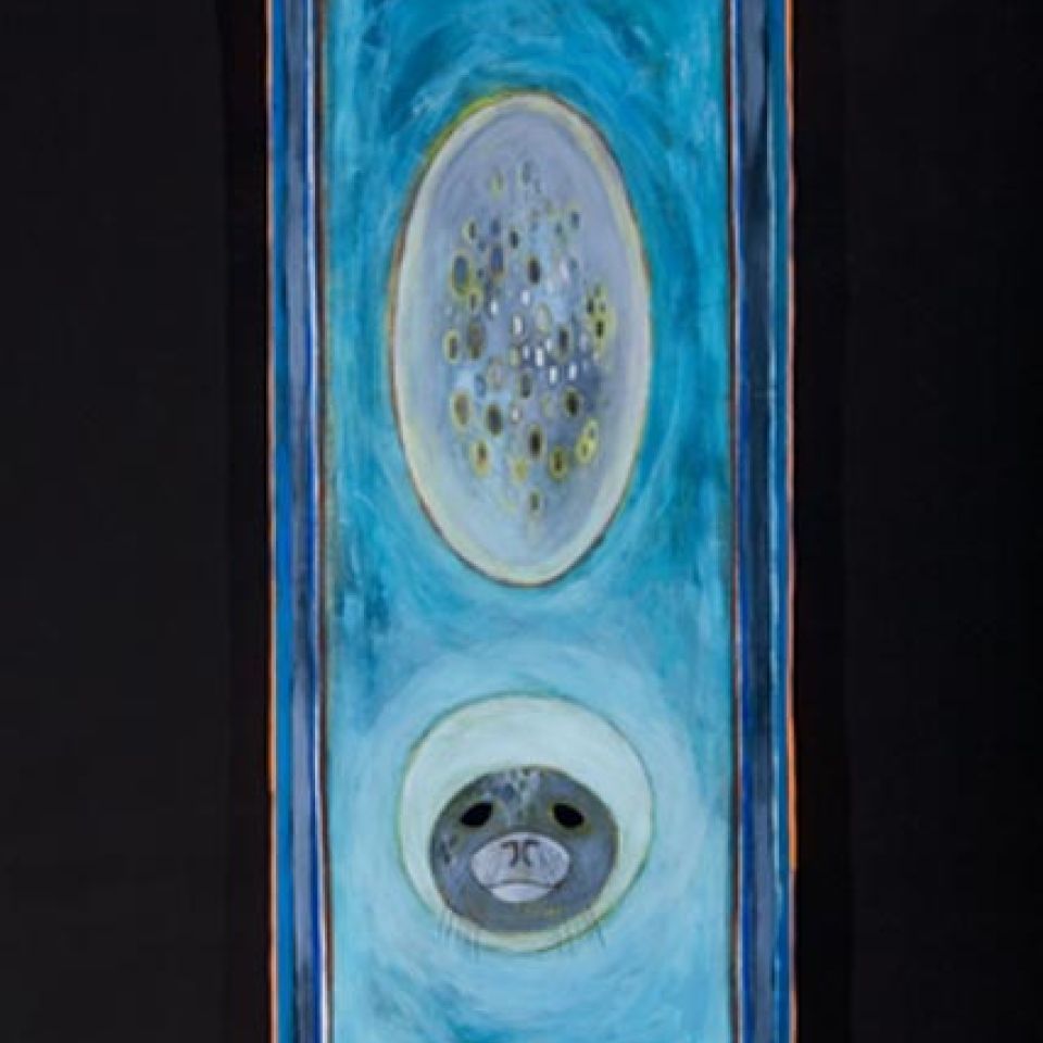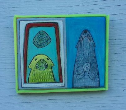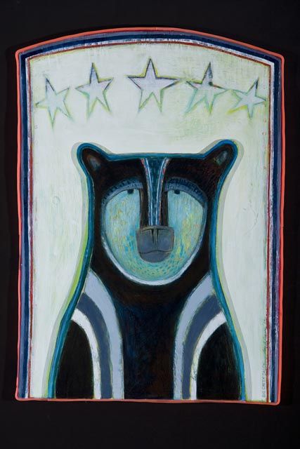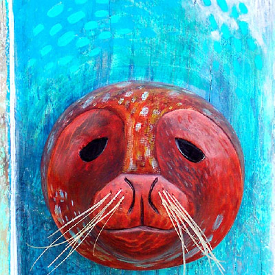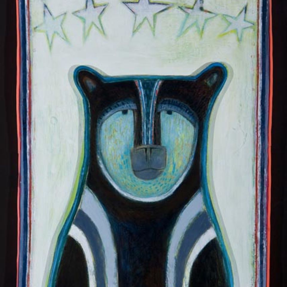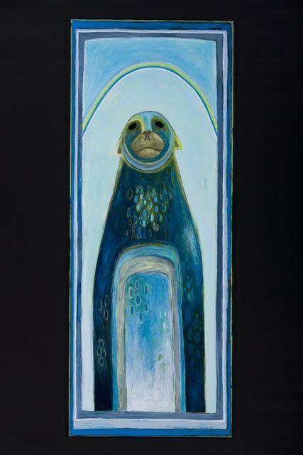 The days of all kinds of weather and attitudes of animals and people of this Island; the humor found in the things we say, the combination of Alutiiq/Russian/English languages to explain situations or create names and titles, experiences of encounters with local animals, birds, and marine life, and the belief systems and unspoken rules, the kind of local knowledge that can save your life if the weather comes up—these are what I pay attention to and what are on my mind as I show up every day to work in my studio, carve knife into wood, layer acrylic, draw into it with pencil, hit areas with sandpaper, and paint with oils. . . . the stories of my lifetime’s heritage that are worth telling.”