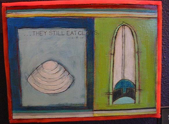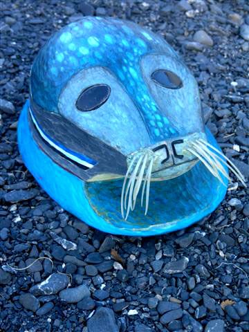 Similarly, out of respect for modern village subsistence and commercial fishing people, I use imagery from this current Kodiak culture: the bold racing stripe combinations and stenciled identifying numbers on our local fishing boats and planes, the splash of a salmon in the net, or the killer whale surfacing near your boat as a warning to leave his fishing area. Marks scratched, sanded, and carved recall the way the wind, sun, and waves alter work surfaces on boats and gear, how seasons and weather affect the shades of the land, water, and sky.