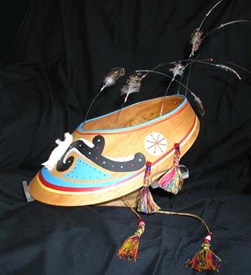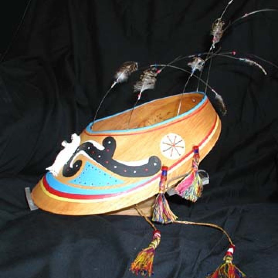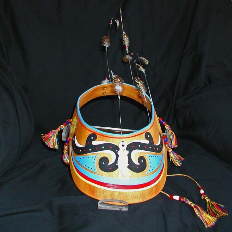 Peter Lind specialized in producing bentwood hunting hats. He enjoys his own proud identity in researching and crafting his art in the Aleut / Alutiiq tradition. The traditional styled Aleut / Alutiiq bentwood visor with its painted geometric designs and decoration of ivory, feathers, and Russian trade beads, honors the spirits and transformed the wearer into a mighty hunter capable of braving the ocean and its dangers. It also hid his human identity from his prey. More visibly, it protected his eyes from glare and sea spray and even improved his hearing.