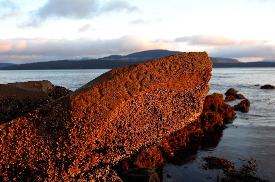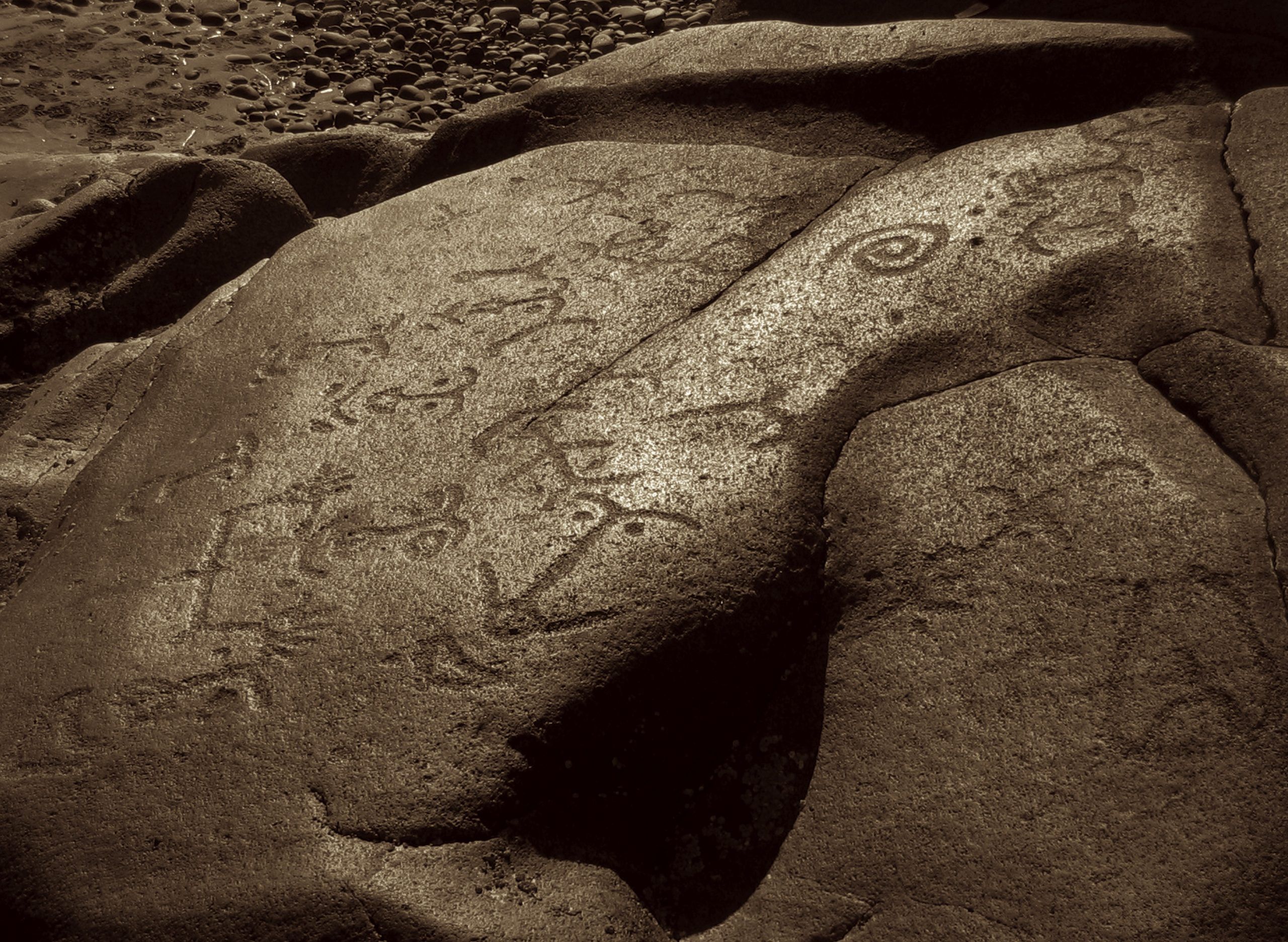 Petroglyphs are designed carved into stationary rock—boulders and bedrock. The ancient carvings are found throughout the coast of the Kodiak Archipelago and some may be over 1,000 years old. Alutiiq/Sugpiaq ancestors made rock art by pecking—using a small rock to chip away flecks of stone and create a design. Archaeologists recognize two general kinds of carvings in the Kodiak region—cupule (pit) and line petroglyphs, and carved images of people and animals.