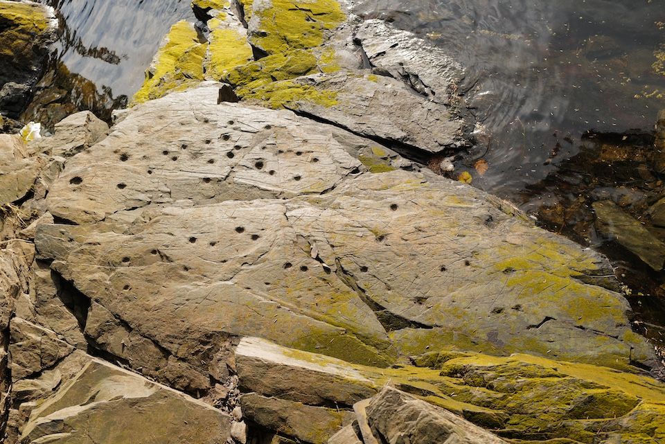 On low-lying rocks, often on the beach or beside a stream, Alutiiq ancestors pecked holes in rocks and sometimes cut lines between the holes. Most of the holes, also known as cupules, are circular and just a few centimeters across. Some rocks have a few holes, others have many. What are these holes? In the Alutiiq world circles and holes are passages between the human and the spirit worlds. Perhaps pecked holes helped the souls of captured fish and animals return to the spirit world so they could be reborn. Cupules are often found by salmon streams and at bay mouths, places where people harvested fish and game.