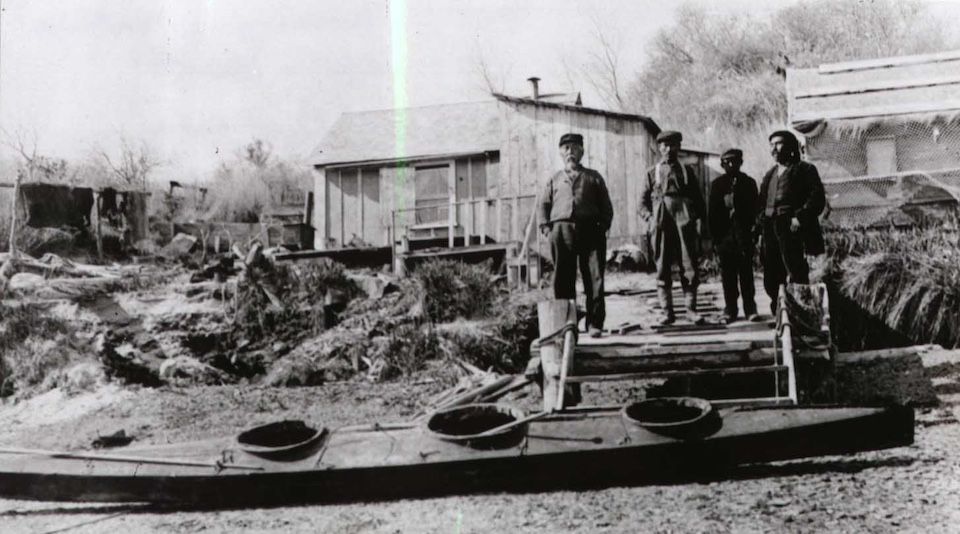 Alutiiq men with a three-hatched kayak, Uganik Village, ca. 1915. Photo by Dennis Winn, McCubrey Collection, Alutiiq Museum Library.