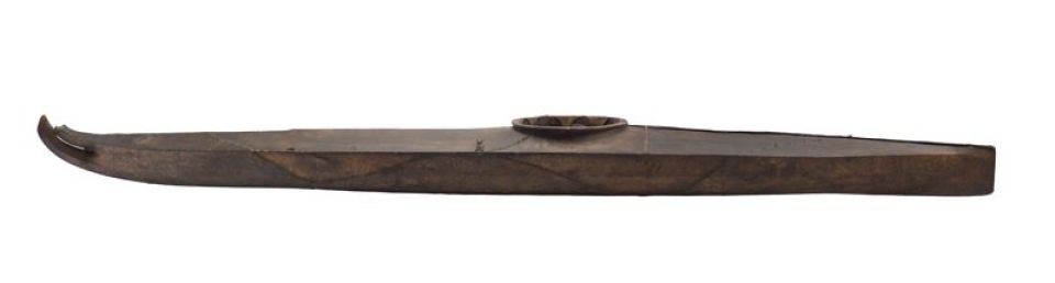 The Fast kayak is 14.5 feet long. It has a lashed wooden frame that is covered in oiled seal skin and decorated with human hair and beads. Photo courtesy of Harvard University, Peabody Museum of Archaeology and Ethnology.