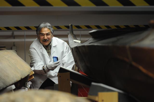 Alfred Naumoff studies the Fast kayak in storage at the Peabody Museum, Harvard University. Photo by Sven Haakanson Jr.