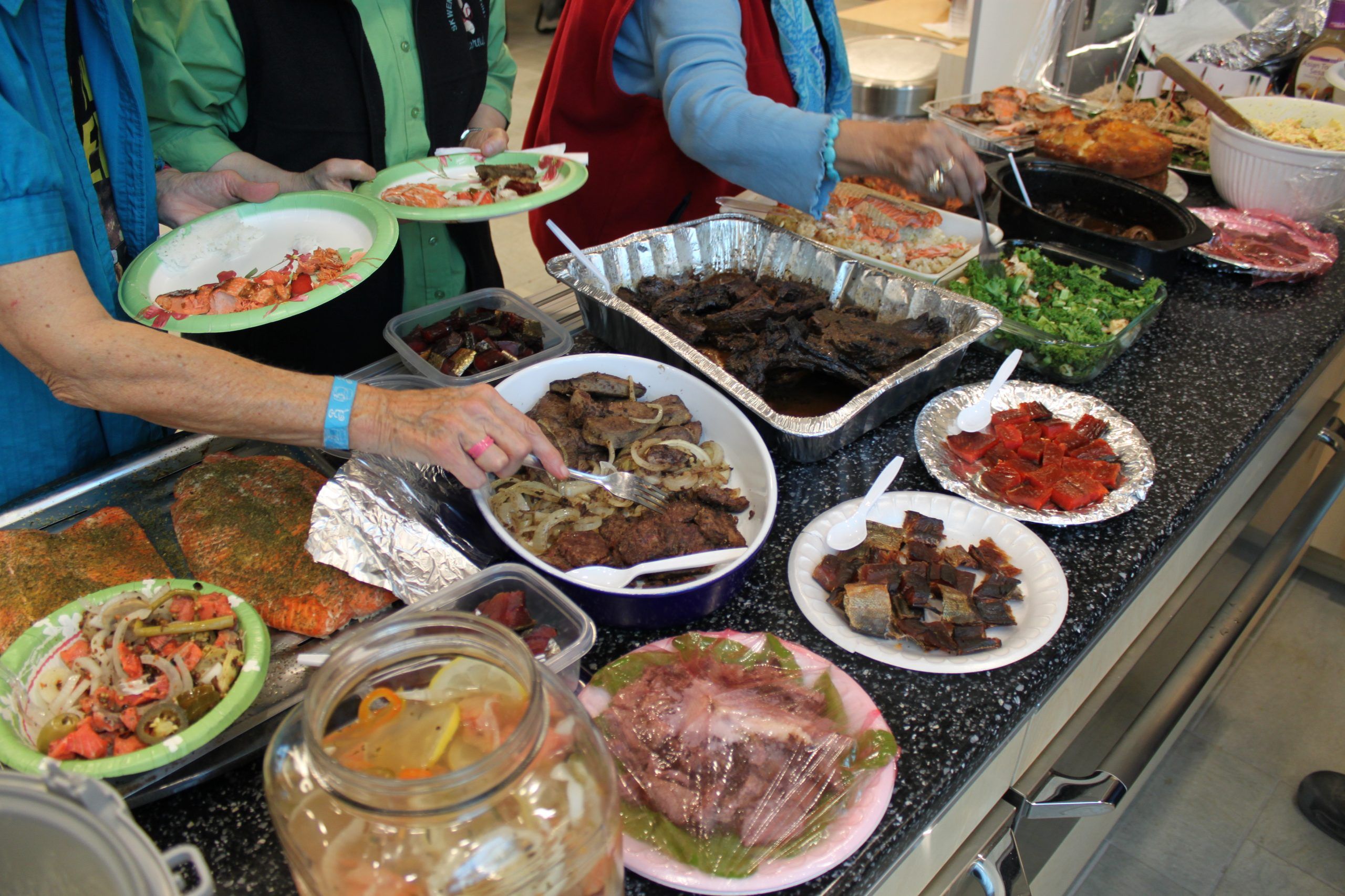 A wild foods potluck featuring salmon, venison, greens, and more.