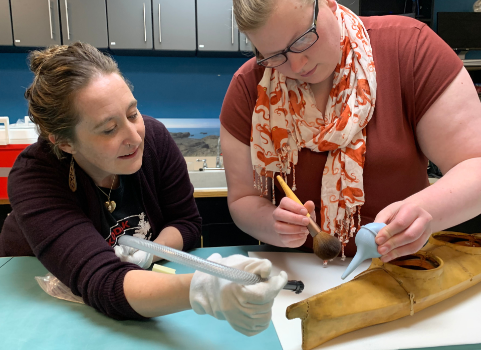 Amanda Lancaster trains Hannah Wolfe-MacPike to clean delicate skin objects.