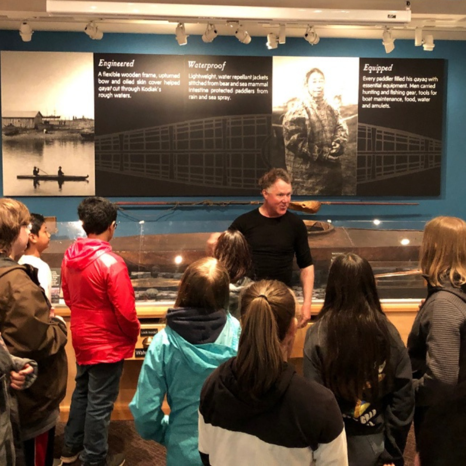 Museum staff member Patrick Saltonstall teaches students about Alutiiq kayaks on a gallery tour.