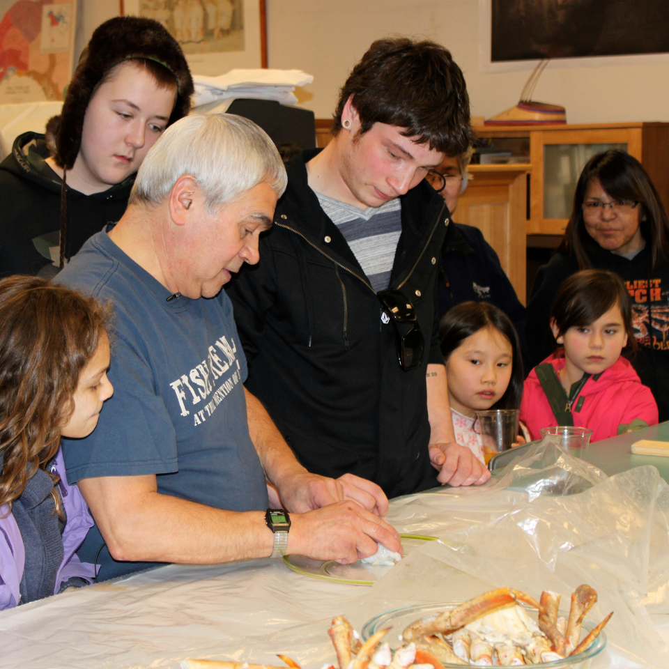 Elder Herman Squartsoff demonstrates how to clean crab meat.