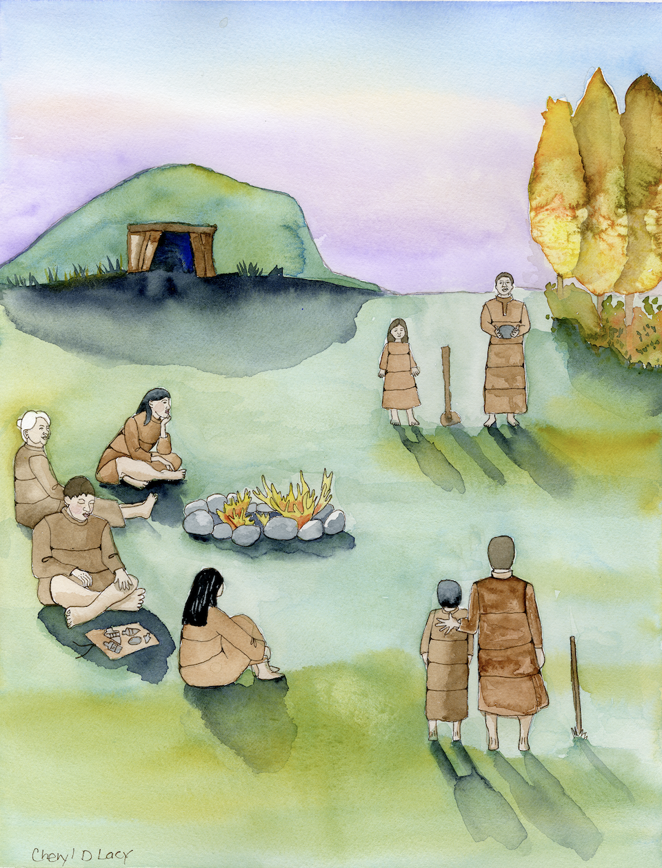 Iqsani’s family plays yaamaq, watercolor by Cheryl Lacy, 2021, produced with support from the Institute for Museum and Library Services.